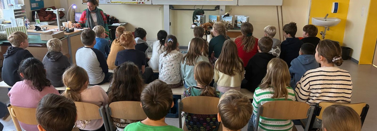 Im Rahmen ihres Besuchs las Frau Reitmeyer in jeder Klasse aus einem ihrer Bücher vor und begleitete die Geschichten mit den farbenfrohen Illustrationen. Die Kinder bekamen so einen lebendigen Eindruck davon, wie Geschichten durch Bilder erweitert und zum Leben erweckt werden.